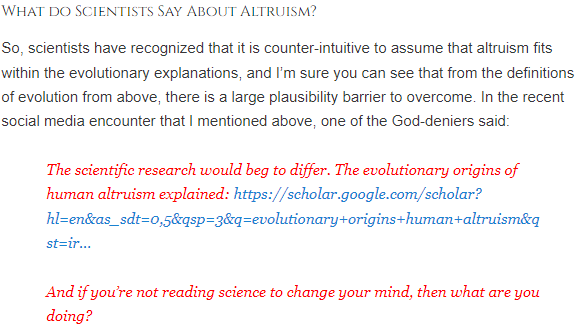 He said this in response to my brief explanation that evolution is incorrect according to the truth that God revealed in both the Bible and in nature from the Christian perspective (external critique). But I immediately continued with the summation of the blog post which showed from the internal critique (analyzing the teachings/writings of evolutionists in their failed attempt to explain altruism via evolution) that the theory of evolution is impotent in accounting for anything altruism. This was a very brief recognition that evolution is not just wrong from my own perspective, but also from theirs