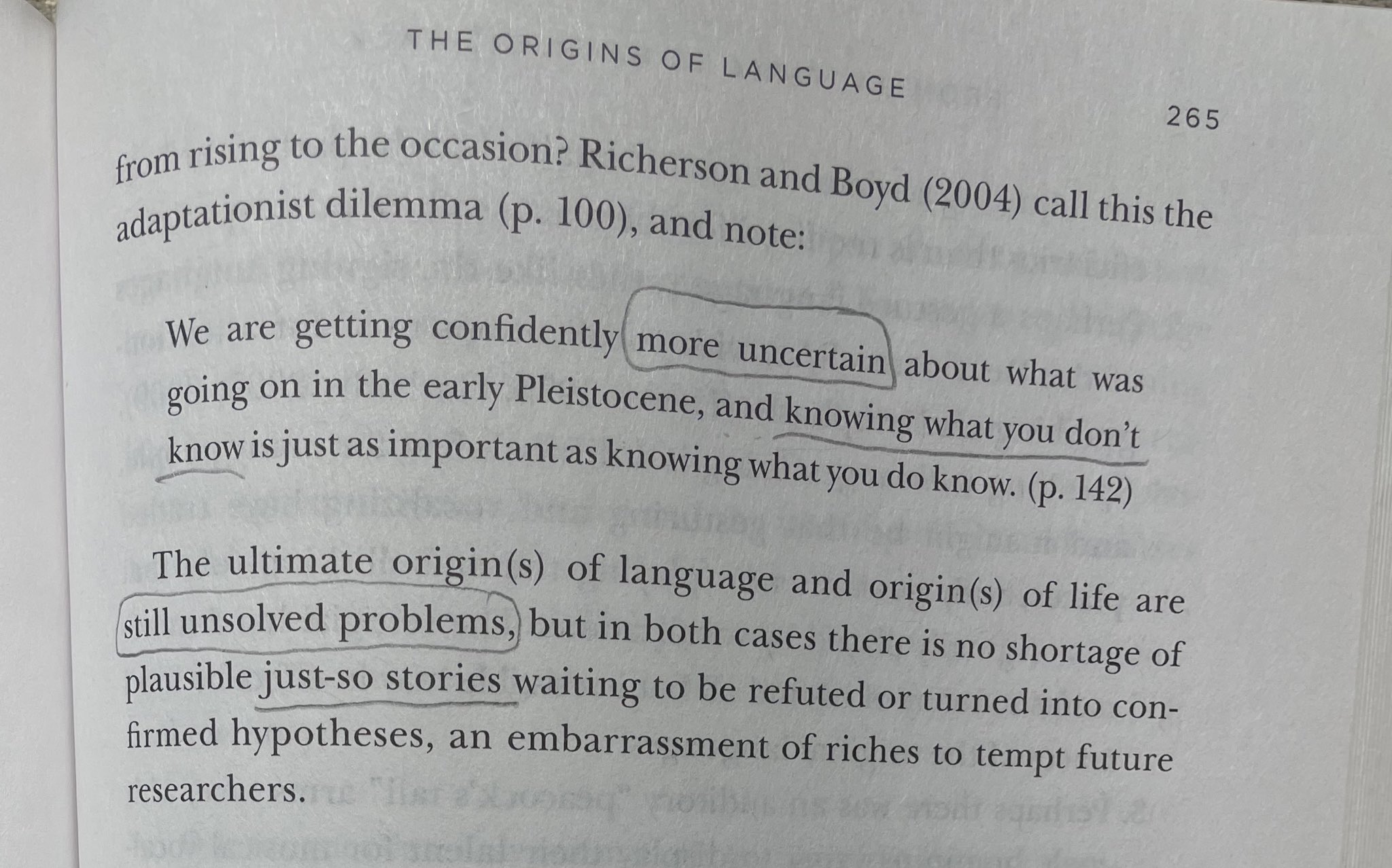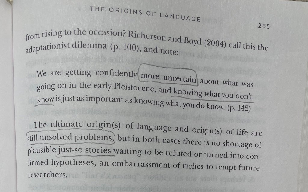 On P264 Dennett continues this discussion with Bickerton’s book where he says “must-have…probably…must have…Somehow” leading to the hinge point of this review and the final death-knell admission for Dennett’s case on p265. I had to include a screenshot of the page, because you might not believe me if you don’t see it with your own eyes: