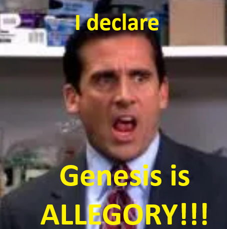 These two opposing stories don’t fit; they are incompatible. Any attempt to bring them into concordance fundamentally changes either the biblical account or the evolutionary account or both. If a theistic evolutionist wants to bring concordance, they must redefine the biblical text, change the order of creation, and change the evolutionary story to say “God-dun-it-differently-than-He-said-but-just-like-evolution-says”. The most common practice among theistic evolutionists is the marginalize the Genesis account by declaring it to be allegory. In much the same way that Michael Scott from the Office shouts out “I declare BANKRUPTCY!!!”, shouting that “Genesis is ALLEGORY!!!” is nothing more than bluster. In fact, it is detrimental to the authority of scripture.