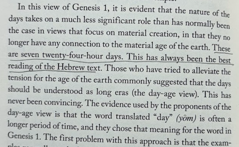 Even John Walton, who is no friend to young earth creationists, open admits on pg 90-91 of his book that the text of Genesis 1 demands that yom must be interpreted as 24hr days.